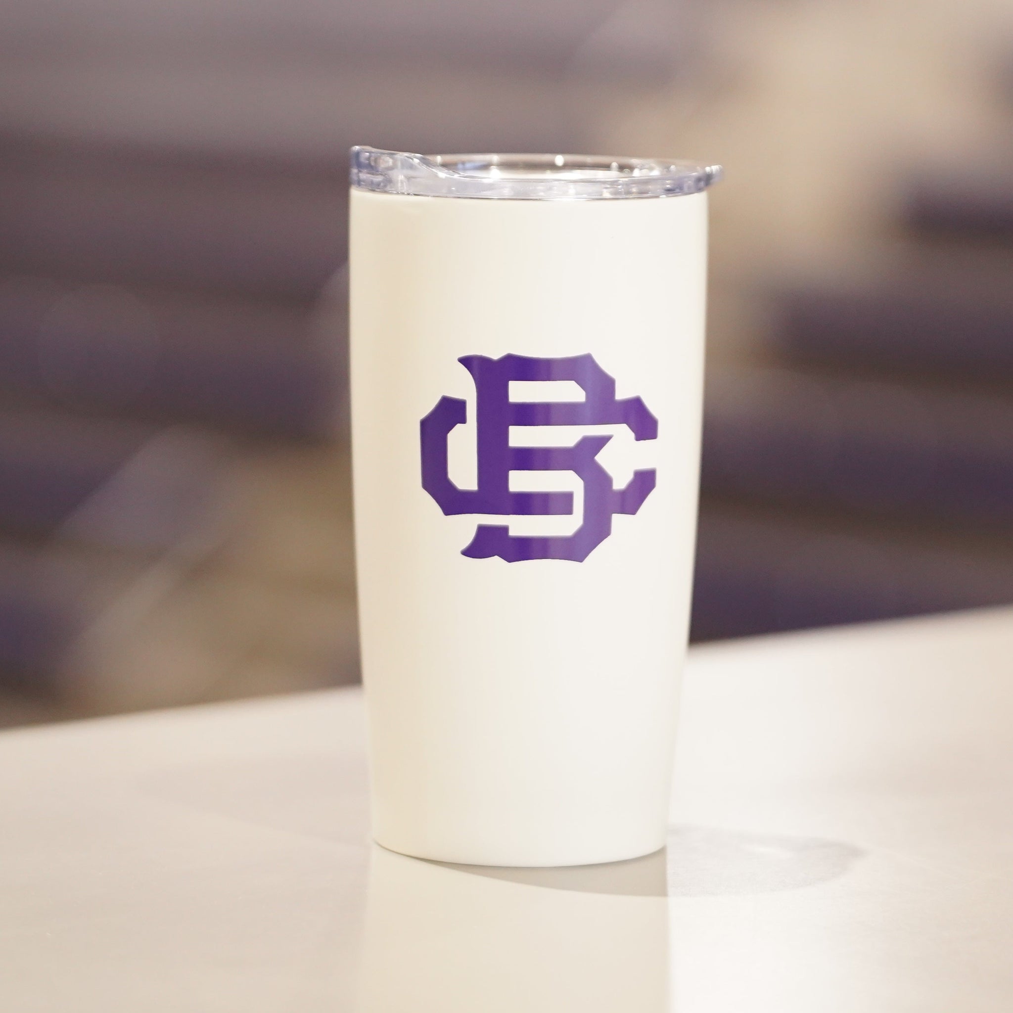 20 oz insulated tumbler with lid. Purple with gold logo.
